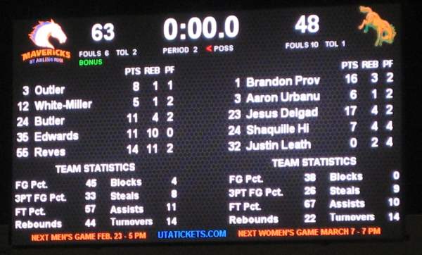UTPA’s tallest player was 6-7 so Jordan and Brandon were able to get a ton of rebounds and putbacks. In my mind, Brandon might be the best dunker we’ve seen at UTA in awhile (although who can forget that one that Stuart dropped on Texas State last year at CPC–look it up on YouTube) and Brandon had another good one last night. Picked up the ball off the floor under the basket and slammed it home. At one point, if the scoreboard was correct, I think we had like a 23-3 rebounding lead in the first half.